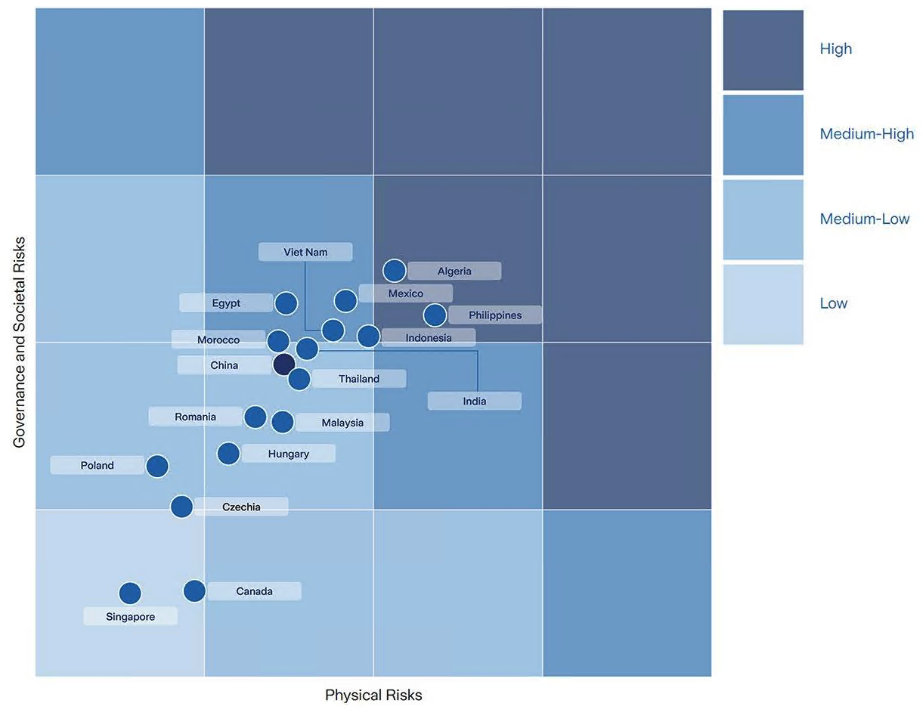 El gráfico de Zurich Risk Room que se muestra arriba ilustra la visión general del complejo panorama de riesgos, tanto en sus dimensiones físicas como de gobernanza y sociales, tal como se menciona en este artículo. Asimismo, ofrece una perspectiva de la amplia dispersión de los niveles de riesgo entre algunos de los países a los que muchos inversores están diversificando sus inversiones como alternativa a China.